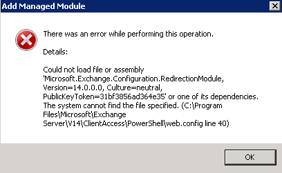 I then came across a blog posting whereby adding and removing the wsman and kerbauth modules in the powershell site in iis.So when i clicked on add-module I got the error displayed in the image below.