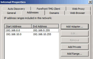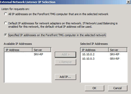 So as per the image above we would need to add the IP’s 10.10.10.2 & 10.10.0.3 to the external nic on the tmg server.During the creation of the web listener when the external network is created we click the radio button and add the dmz ips we added earlier on as per the image below.
