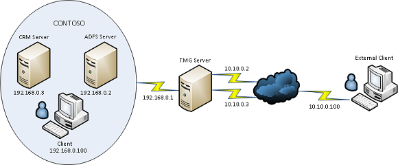 So the image below describes the required topology for CRM 2011 IFD via TMG and I will outline the steps needed to implement this and get it working as there are quite a few things left out of the official Microsoft documentation.