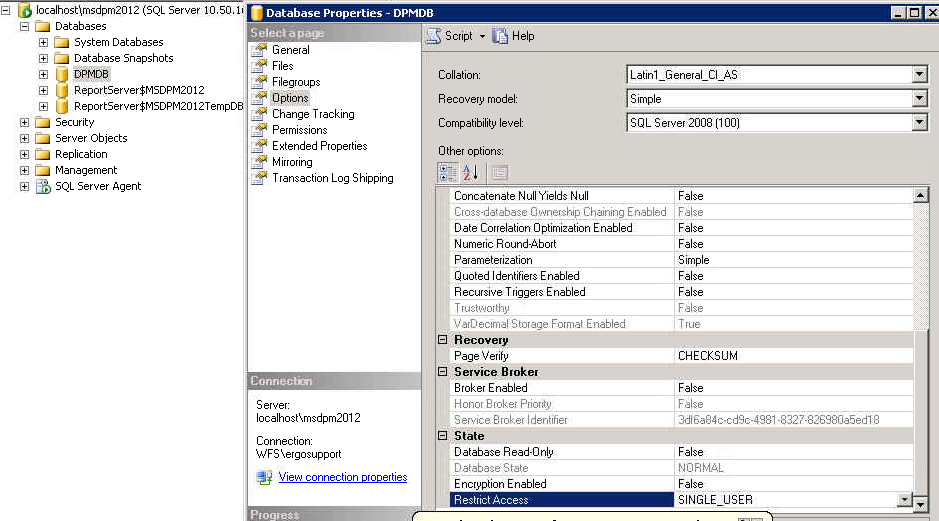 - So once we have done a backup , the trick is to set the options on the DPM database to single user mode as per the image below.So once this is done. You can install Rollup 3.
