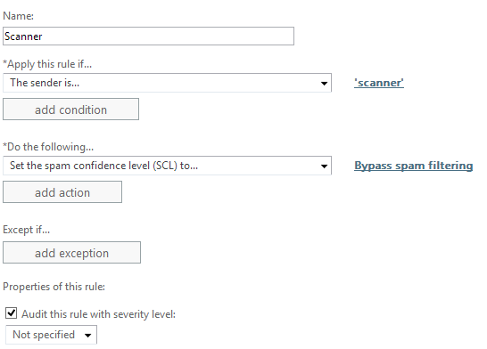 Then specify the sender as ‘scanner@contoso.com’ with the default options.