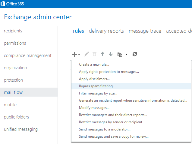 Then go to mail flow and add a new rule as per the image below, selecting the bypass spam filtering rule template.