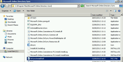 3. Next , browse to C:\program files\Microsoft Online Directory Sync\DirSyncInstallShell and follow the install syntax in this Microsoft Article