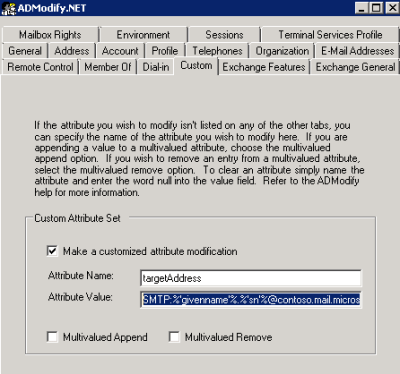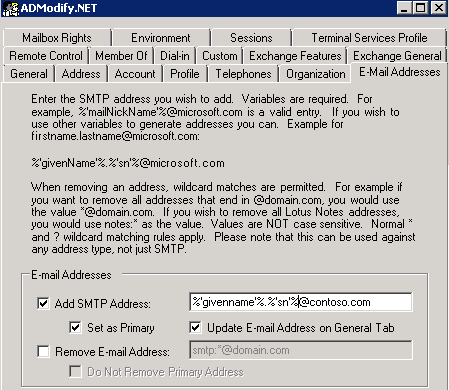 So we connect to our active directory via admodify and select all the users or organisational units we want to modify and add them to the list we then enter ‘%’givenname’%.%’sn’%@contoso.com‘ on the email address tab