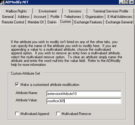 Lets say you don’t want some users to sync to exchange online , you can filter them by what organisational unit gets synced or you can use admodify again to modify a custom attribute by entering ‘nooffice365‘ as per the image below in the ‘extensionAttribute10‘ attribute
