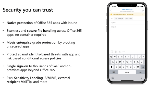 I always recommend the Outlook mobile client to my customers as this application can be included in an Intune app configuration & protection policy to protect and encrypt corporate data.